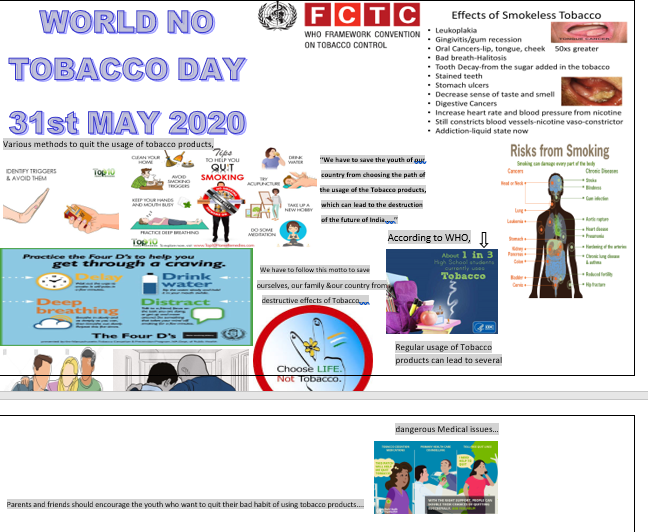 The World No Tobacco Day was celebrated on 31 May this year on the theme “Protecting youth from industry manipulation and preventing them from tobacco and nicotine use”. An online zoom session was conducted with insightful talks by Dr. Suzanne Nethan, NICPR-ECHO (India) & Dr. Amit Yadav, University of California (USA) on the various tobacco industry tactics to attract the youth towards tobacco use. A virtual poster competition was also held for children aged 9 to 17 years on this theme. The event saw widespread participation from across the country.